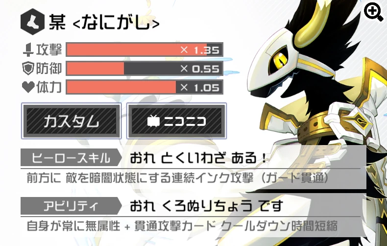Always have non-attribute + Reduce the cooldown time of Pierce cards by 20%. Because Nanigashi is always attributeless, Joker's dash attack will not knock him down, unless Joker's HS is activated.