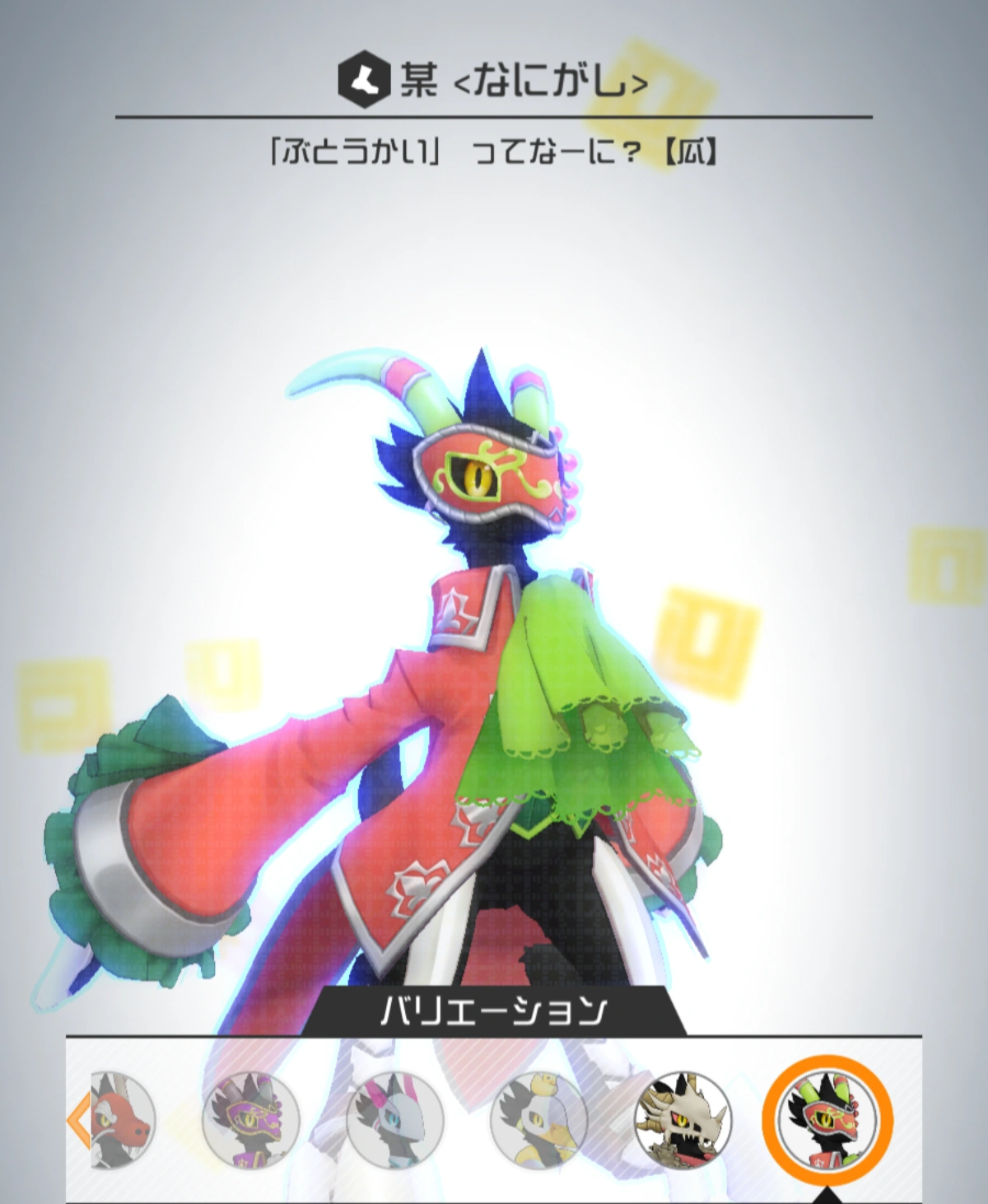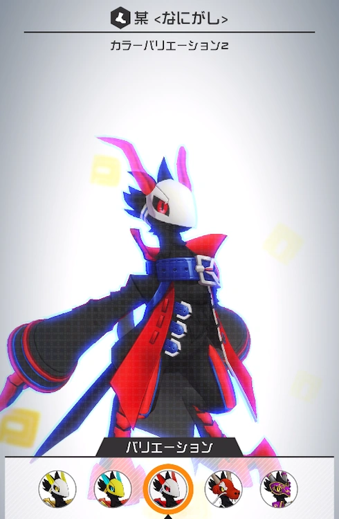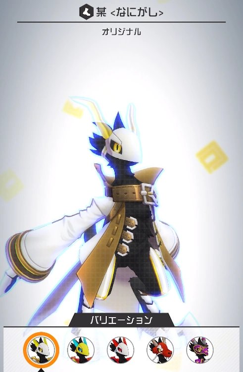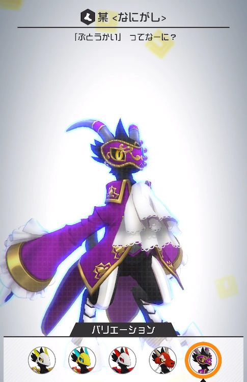 Nanigashi is a bird-like creature with pure black feathers. The only color on his body is in his yellow eyes and horns. He usually wears a white mask, but can take it off, as seen in one of his tap reactions.